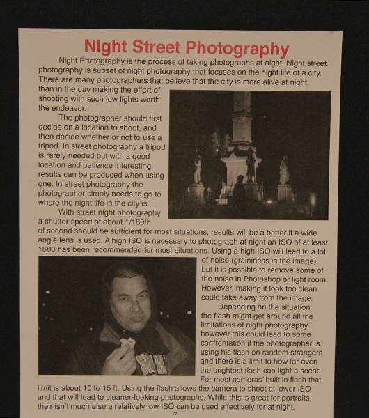 A two color offset page featuring a brief description on taking photographs of the night life of cities